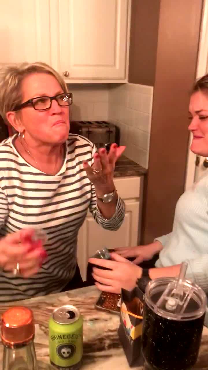 A tot girl brings a beach towel to her mother in the living room after her young sister drops the towel and runs behind a wall as she does the What the Fluff challenge.