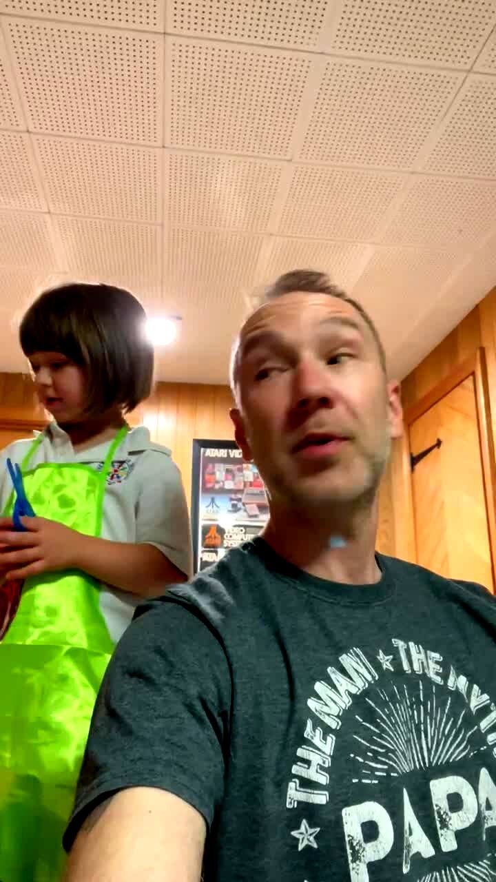A man goes to give a dog a treat in slow motion and the dog jumps up then falls backwards onto the kitchen floor.