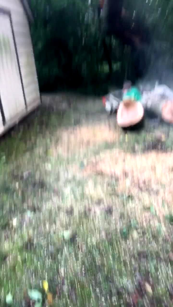 While on a phone call, a man topples off of a front porch in a rocking chair. Security footage.