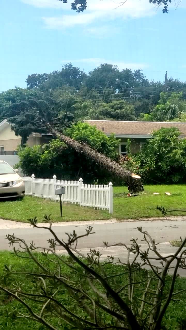 A man stands in the yard and works to chop down a tree with a chainsaw. When the tree starts to topple in the wrong direction the man runs out of the way before it crashes onto the roof of a nearby house. No release for the man (face not recognizable).