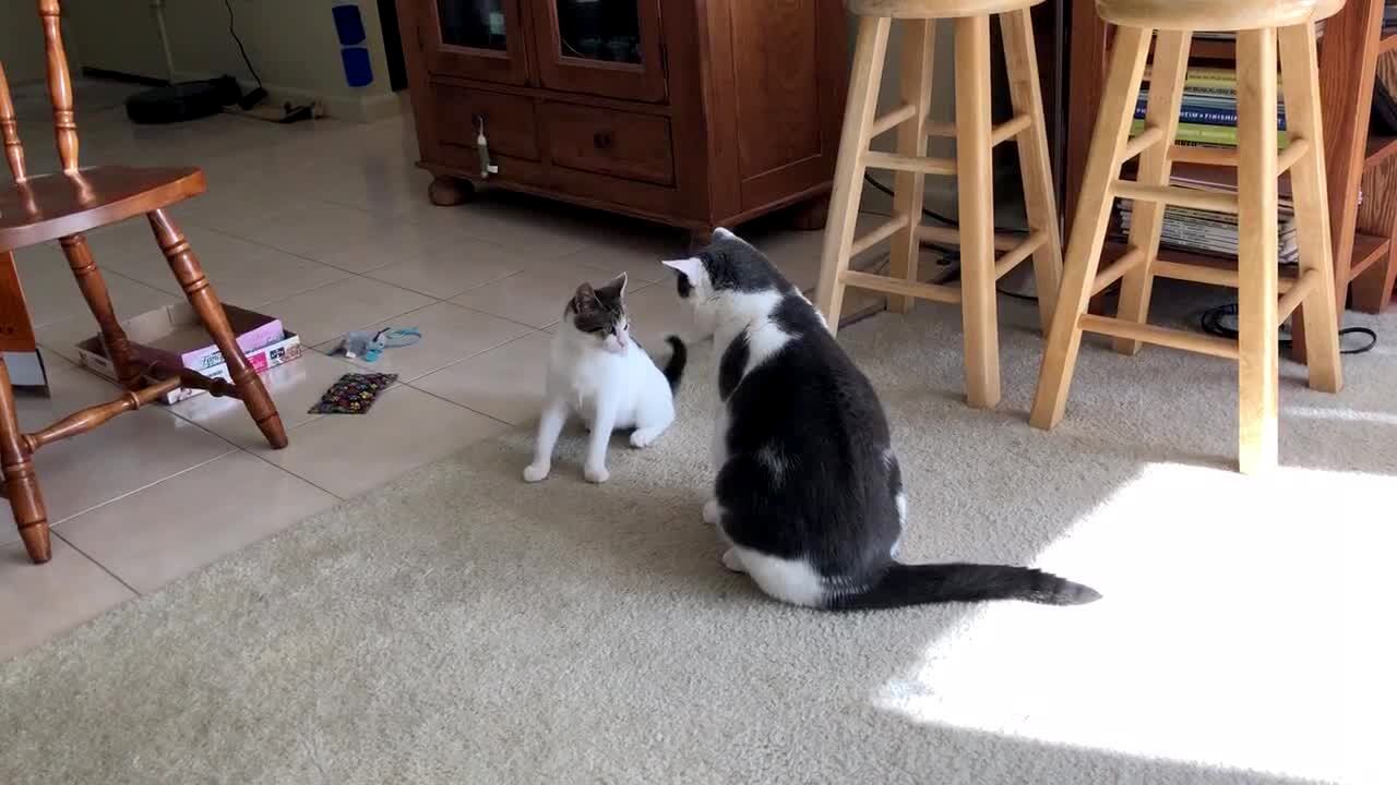 A tot girl get lotion in her nose when she squeezes a tube of lotion after her mother tells her to smell it.