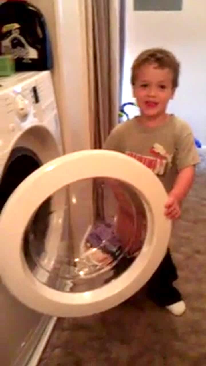 A tot boy with his pants down pees into a washing machine at home. His mother lectures him and he is unapologetic.