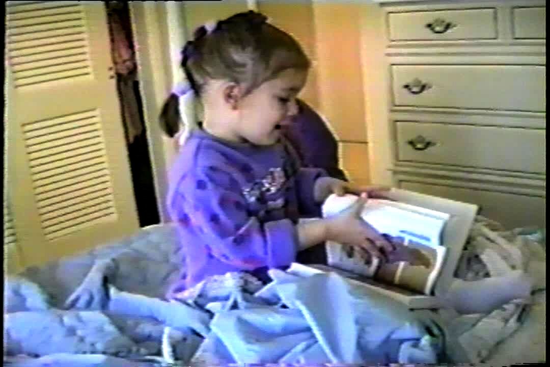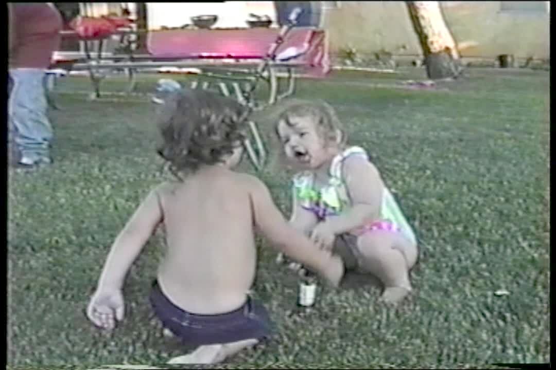 Teen girl picks up tot girl and spins her around in the living room. Another little girl walks up and gets kicked in the face.