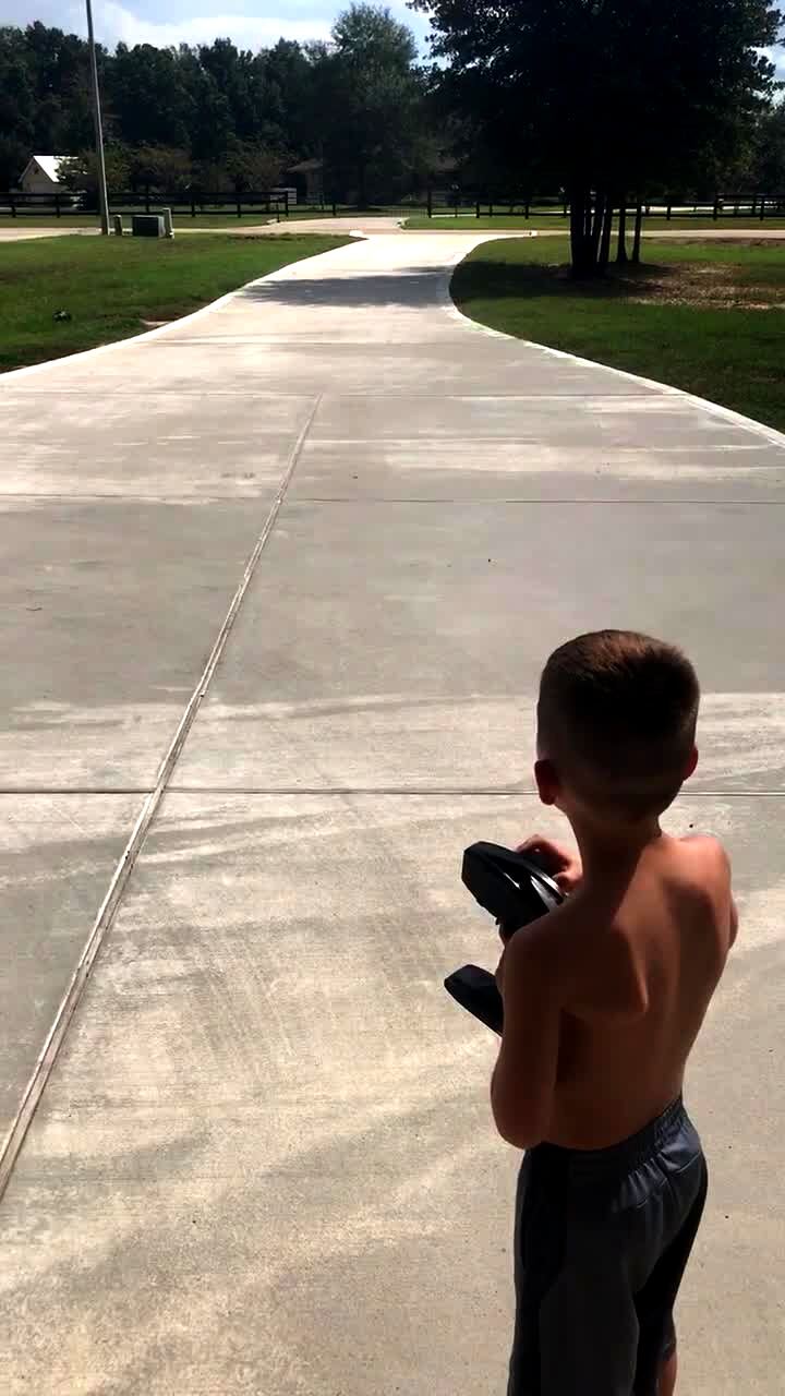 A young boy falls in the driveway when he drives a remote controlled car in to his feet.