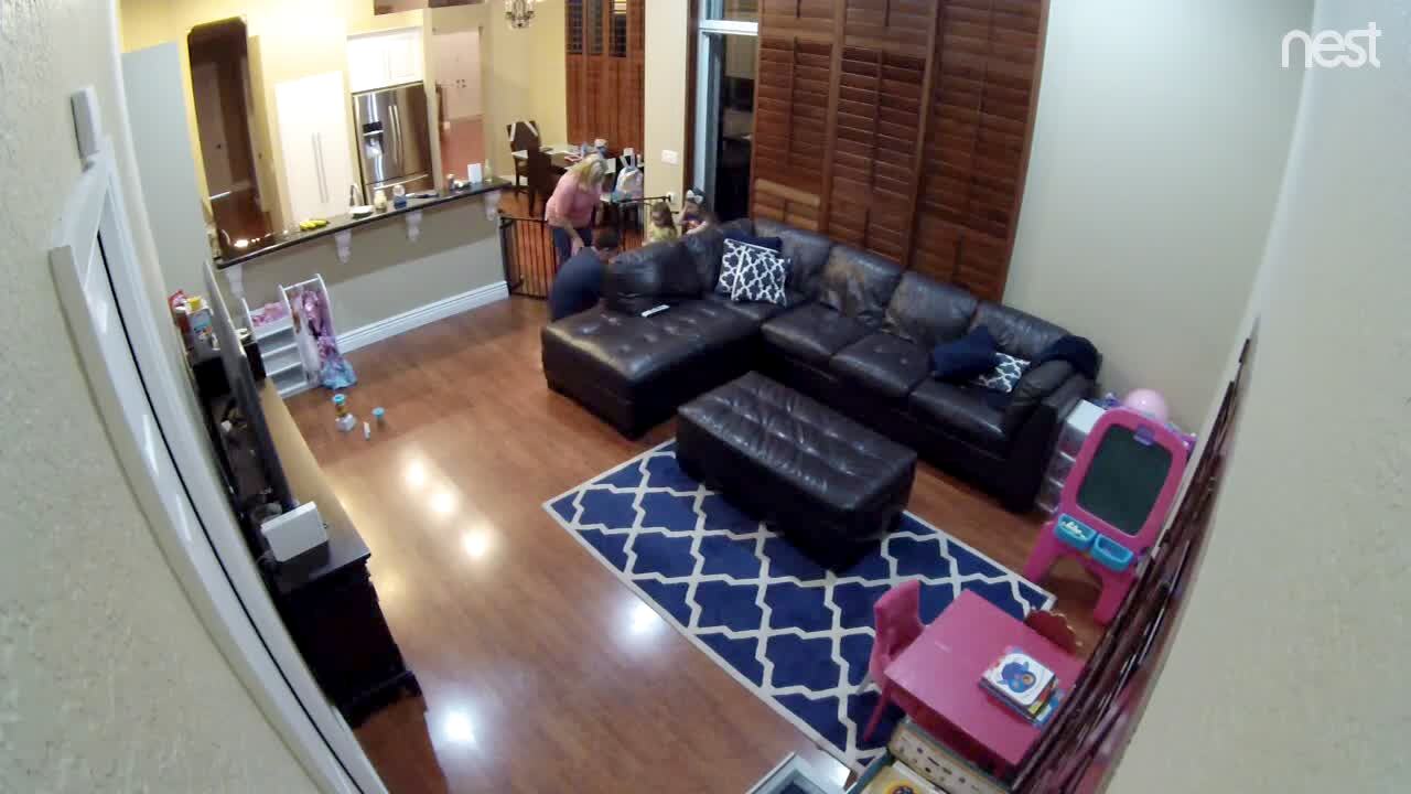 A toy basketball hoop falls on a tot boy when he dunks a ball into it in the living room.