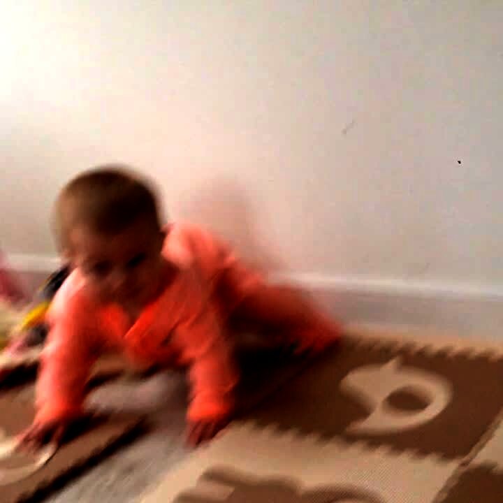A baby girl crawls indoors and a dachshund dog pops its head up into frame in front of her.