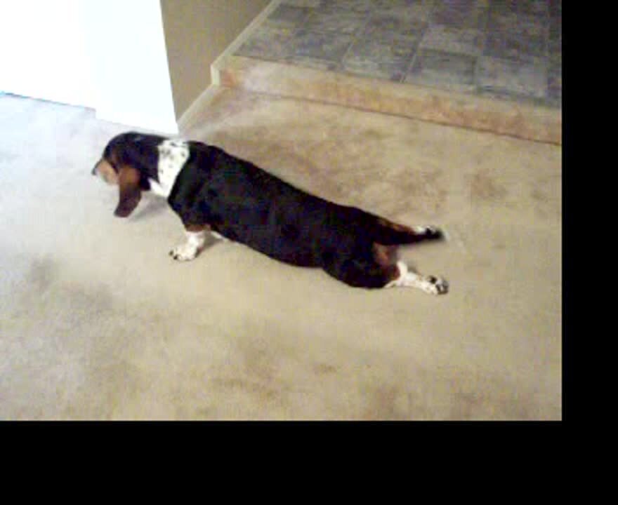 Hound dog drags its hind legs through the hallway and into the den, moving very slowly.