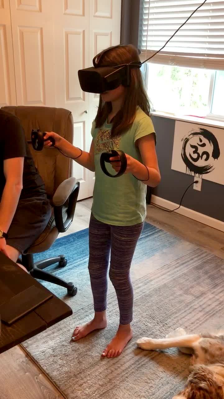 A woman sits in a chair wearing a virtual reality headset and leans forward with the controllers, falling to the floor.