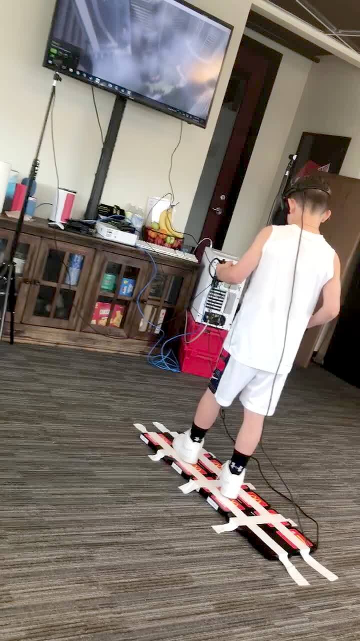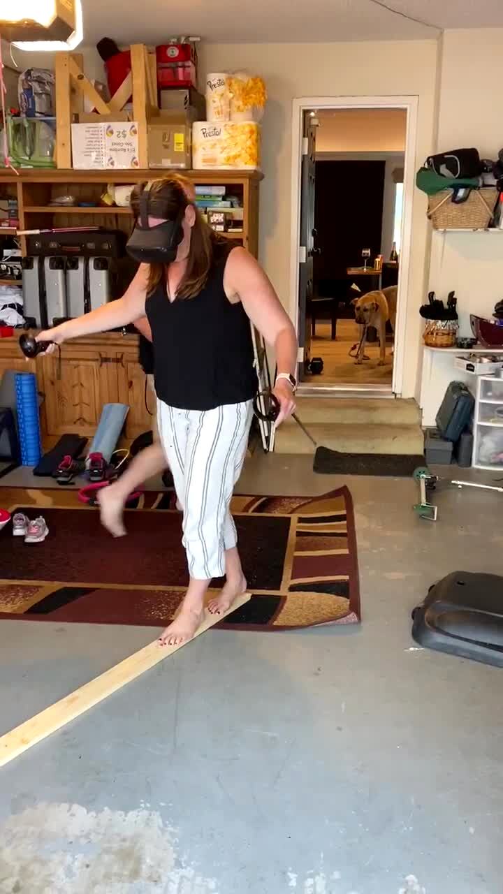 A woman falls off a wooden plank when she uses a VR headset in the garage.