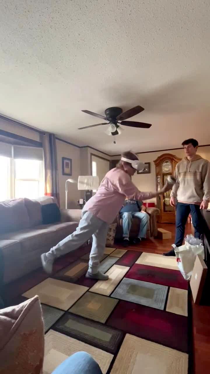 A woman wears a virtual reality headset and punches the air and falls forward and hits her head on the entertainment center.
