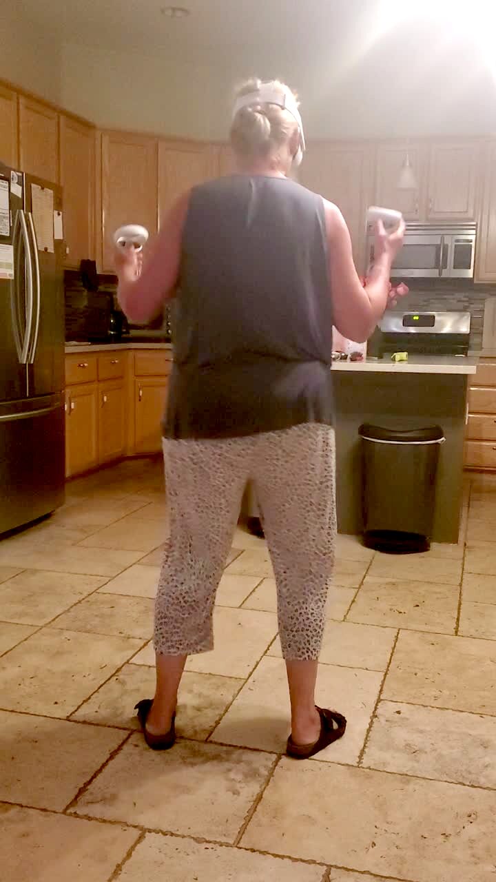 A woman dances with a virtual reality headset in a kitchen and loses her balance and falls down.