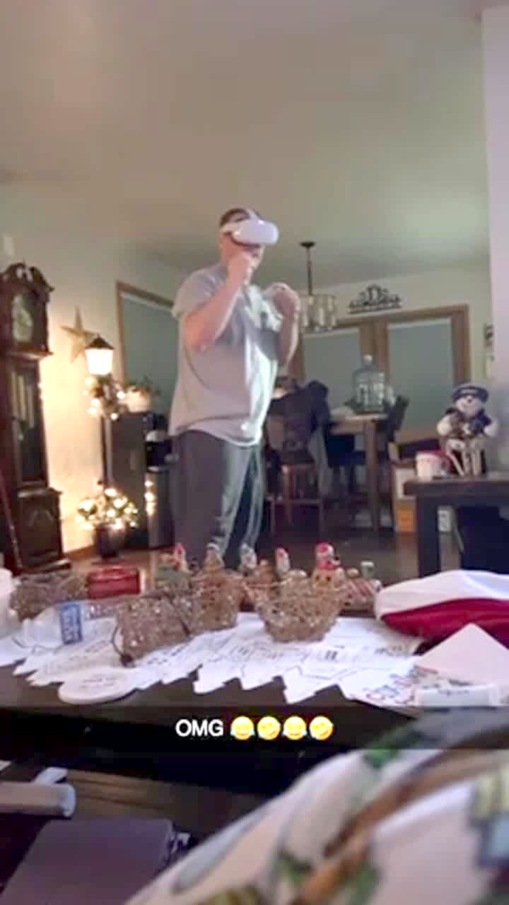 A man plays a virtual reality game in a living room and runs and crashes into a table and falls over. Security camera.