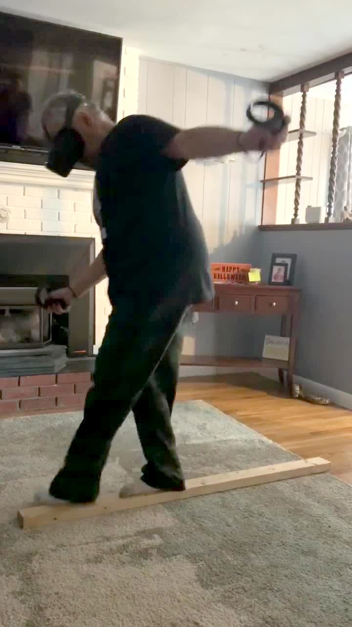 A man walks on a beam in the living room as he plays a virtual reality game, but he loses his balance and falls against a wall.