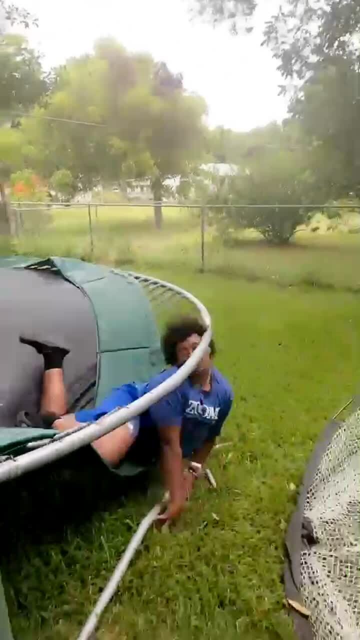 Teen girl tries to swing in kiddie swing in backyard playground, swing breaks and sends her flying into yard.