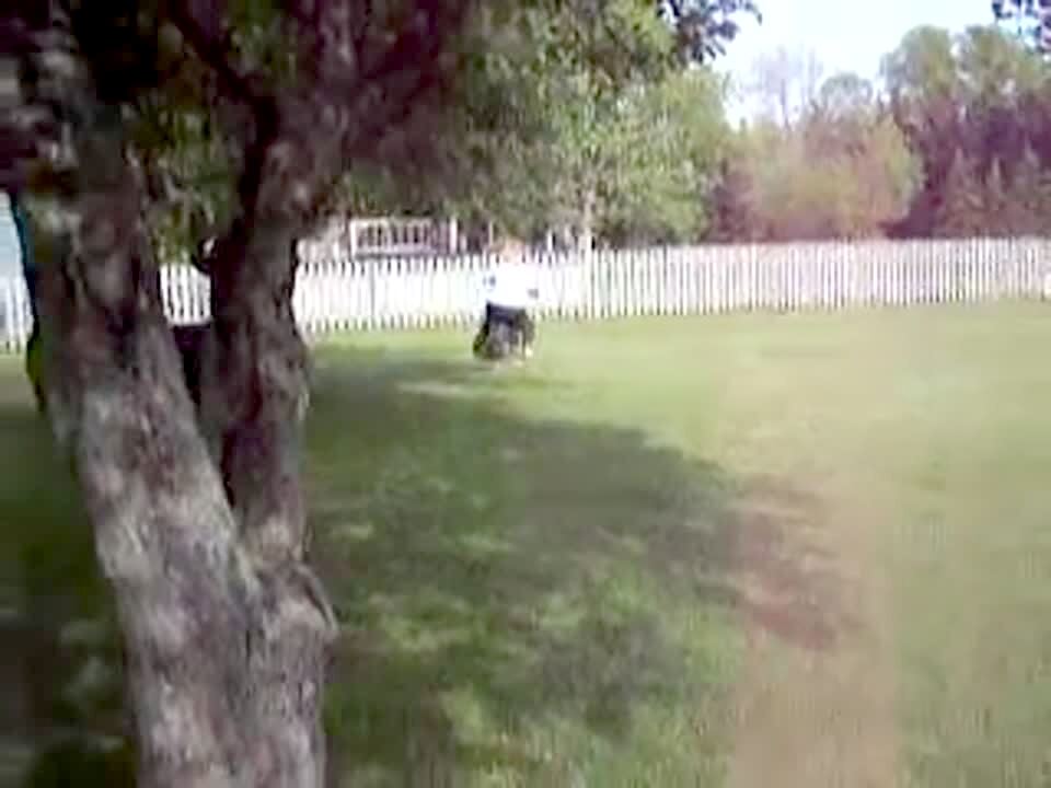 A senior woman tries to ride an electric scooter in a yard and can't. Around 0:40 she trips and stumbles across the yard before she falls.