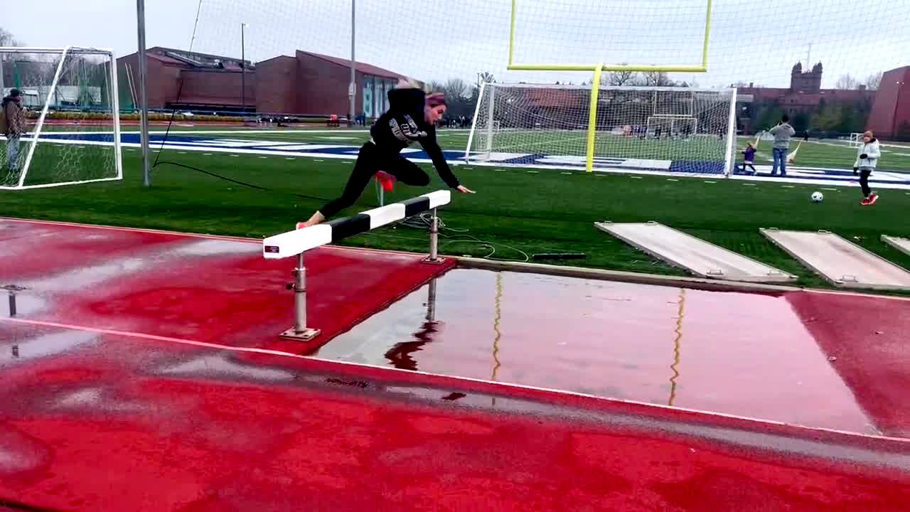 A woman jumps over a track hurdle and falls into a rain puddle. Featured talent cleared only (the woman who falls into the puddle).