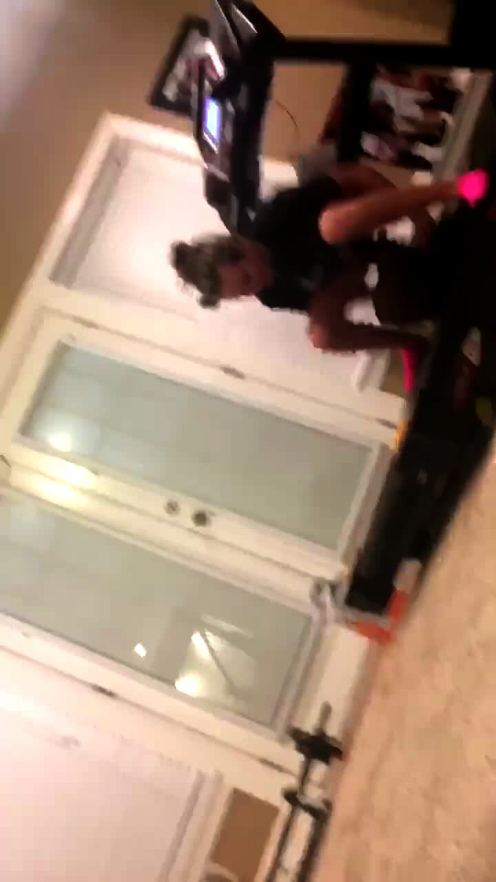 A teen girl runs and does a jump kick in a living room, then runs into a wall and falls down.