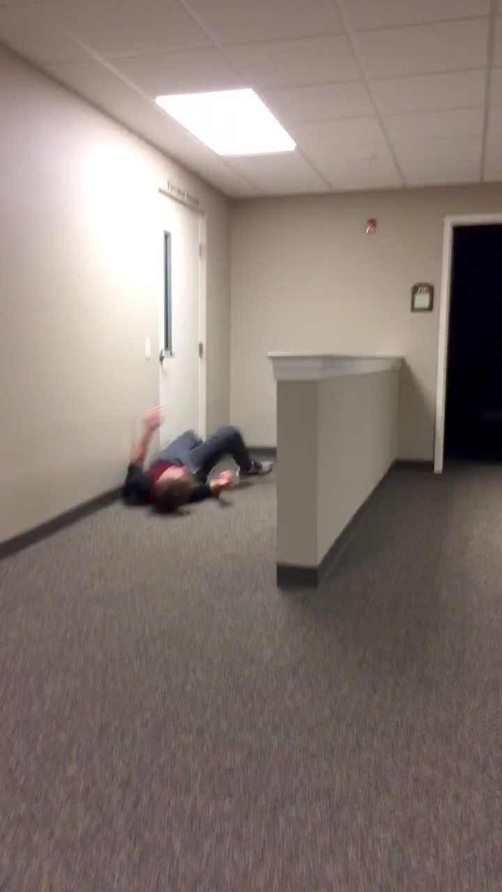 A teen boy falls over a low wall in a church when he can't jump high enough over it.