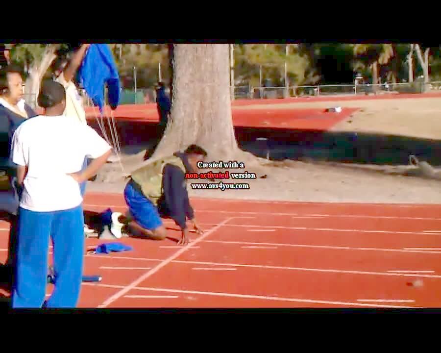 Teen boy runs on an outdoor track dragging a parachute behind him for resistance. The parachute hits and knocks over a teen girl running beside the track. Short tails.