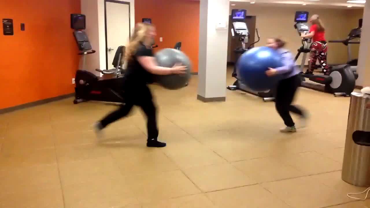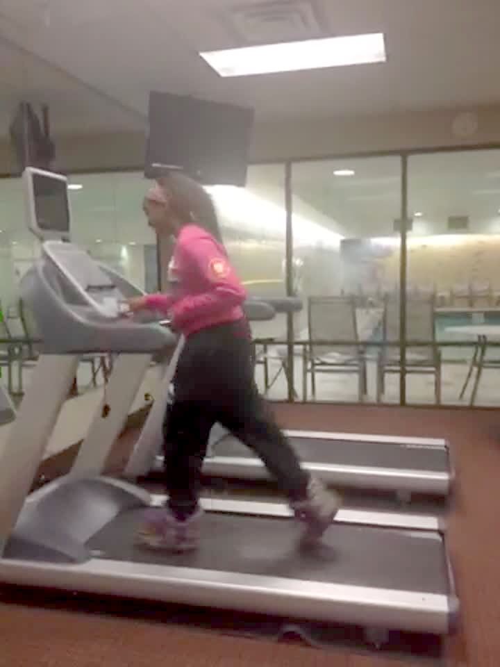 A teen girl texts on her phone while she steps onto a treadmill at a gym and slips and falls down.