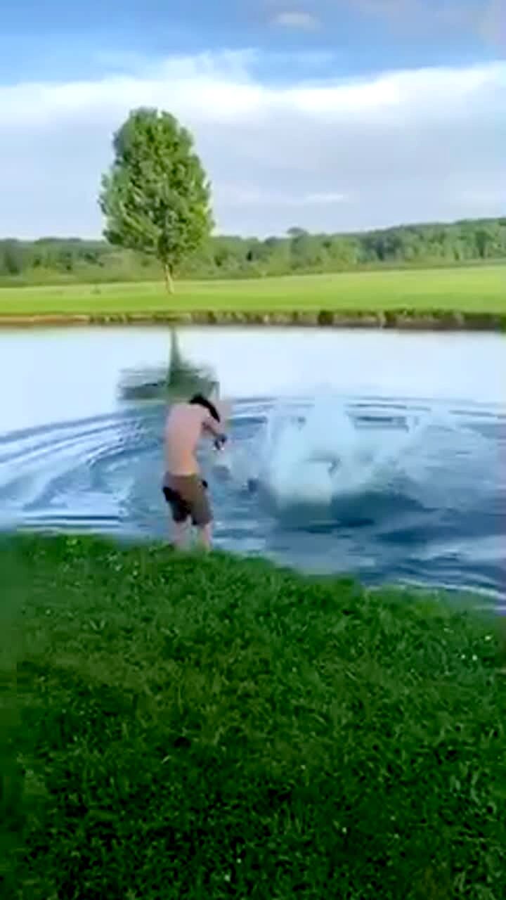 A group of teen boys jump over one boy and into a lake. The last teen hits the boy and they both fall into the water.