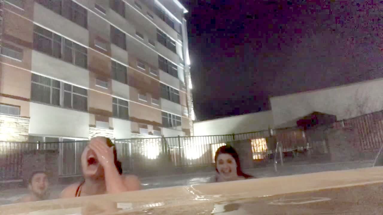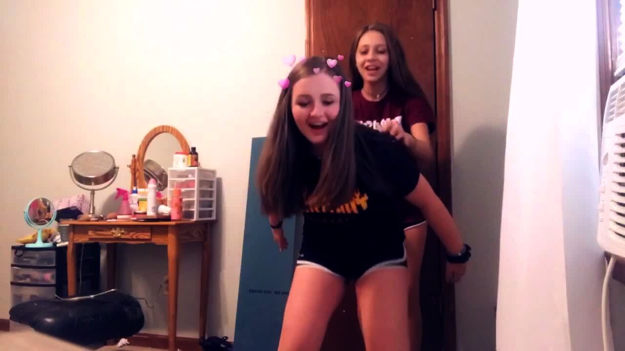 Two teen girls break a mirror in a bedroom when they fall as one of them jumps on the other's back.