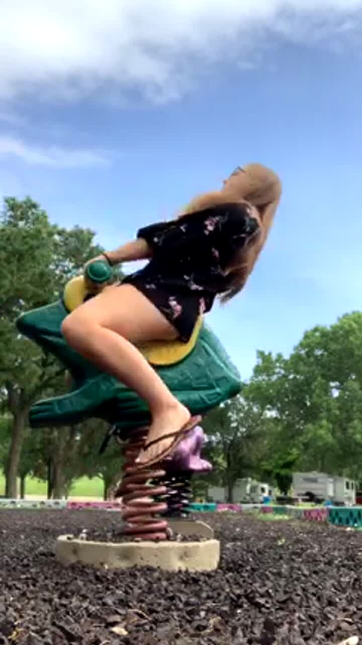 A teen girl falls at a playground park when she flips over the handlebars of a spring rider as she rocks back and forth on it too hard.
