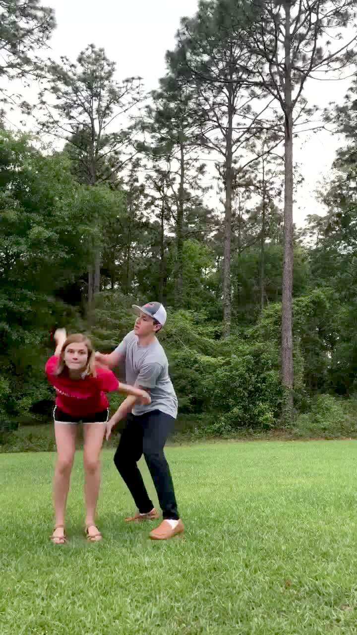 A teen girl falls in the backyard when she jumps in the air as a teen boy spots her as she tries a backflip.