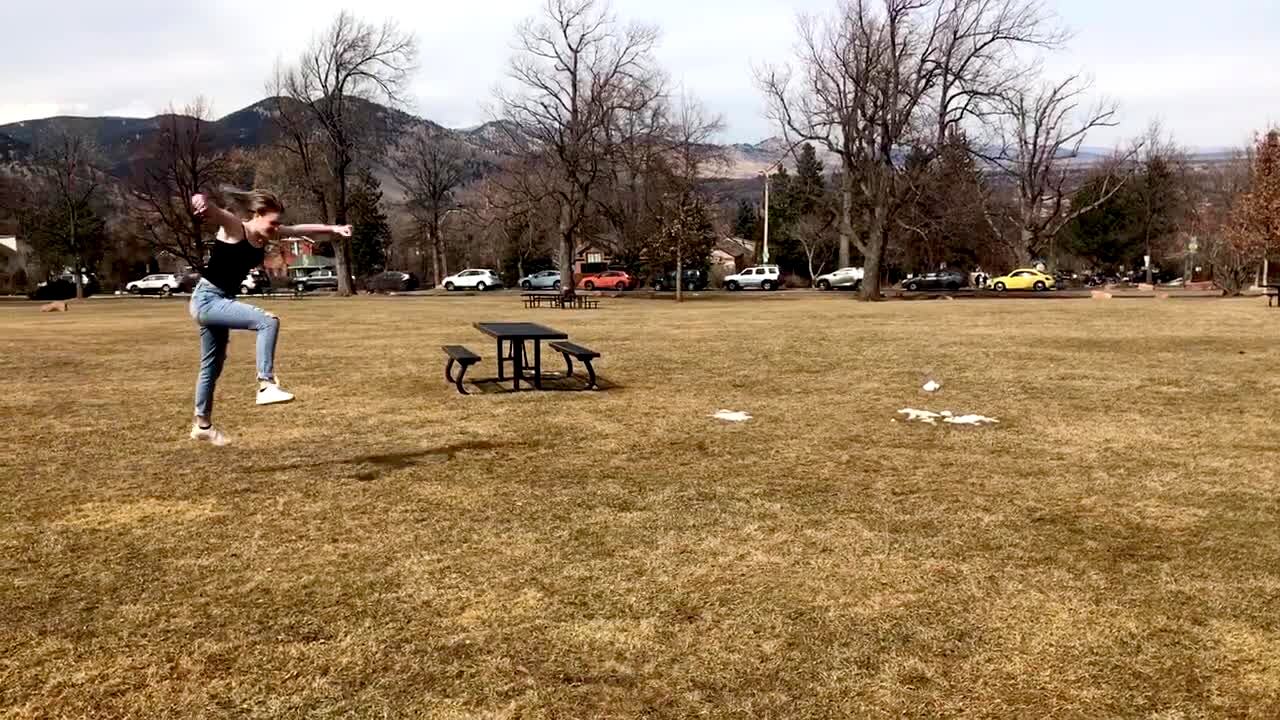 A teen girl runs and jumps to do an aerial flip at a park, but slips on wet grass and falls instead.