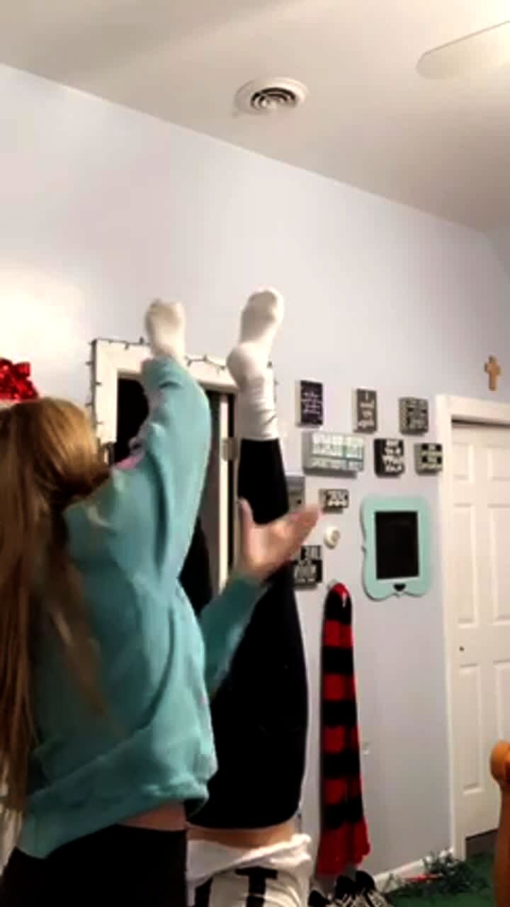 Two teen girls fall in a bedroom when they lose their balance as one of them lifts the other up by their legs as they do a handstand.
