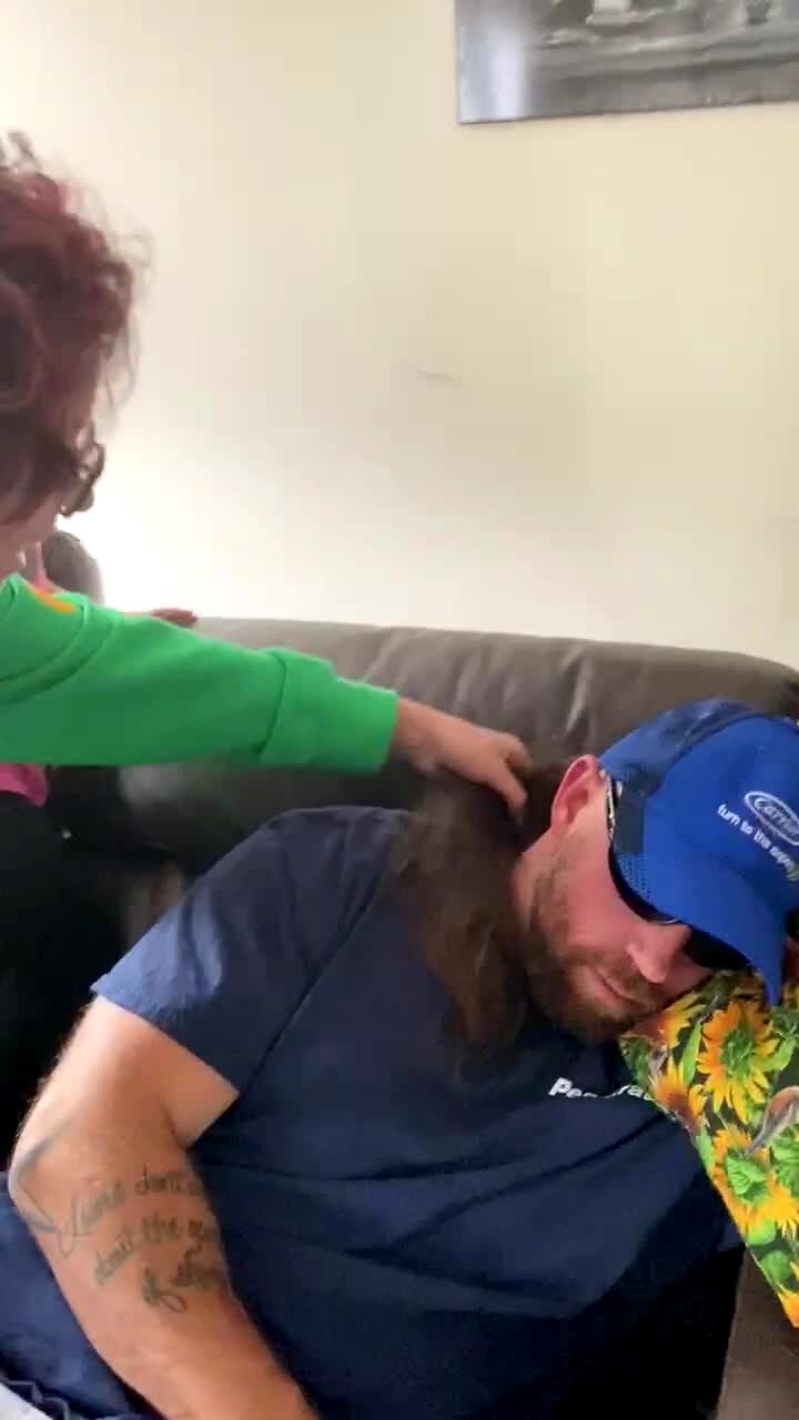 An iguana lizard sits on a man's chest and it smacks him in the face with its tail repeatedly.