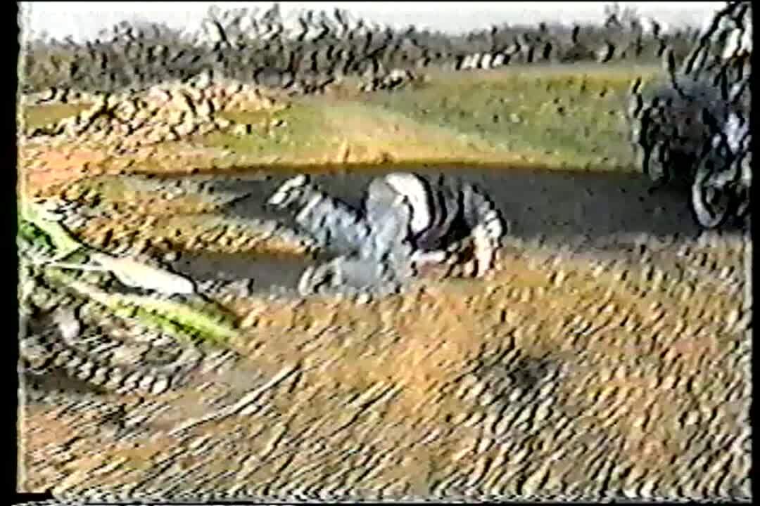 Man makes 4 wheeler jump over the dirt into a mud puddle, man falls off. The ATV / motorbike keeps going & man chases it. With recovery.
