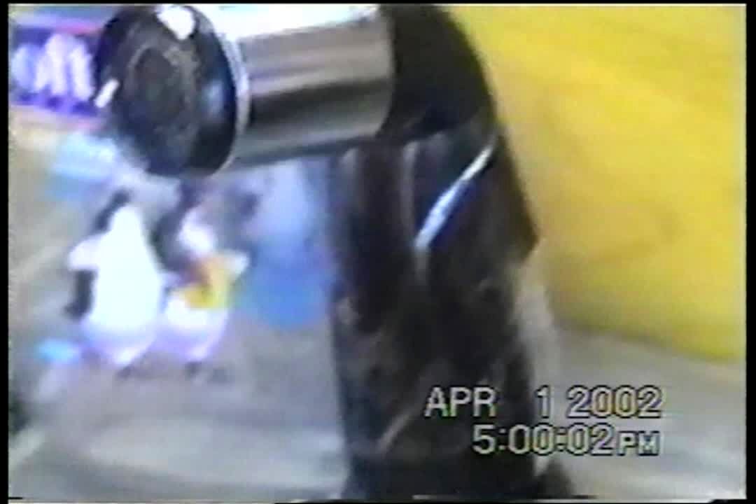 A man operates an industrial sized mixer in a bakery kitchen. When he turns it on, flour shoots out and goes all over this woman coworker. Security Camera Footage. Work