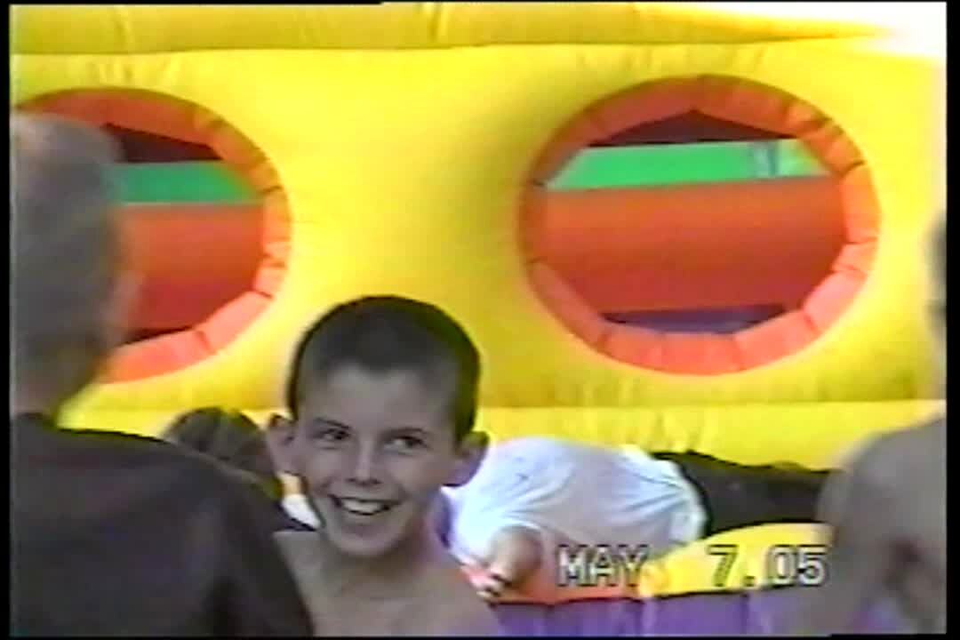 A man climbs out of a kiddie pool in the yard and then jumps into a bounce castle. He slides across the castle and hits the wall on the other side and flips the whole thing over.