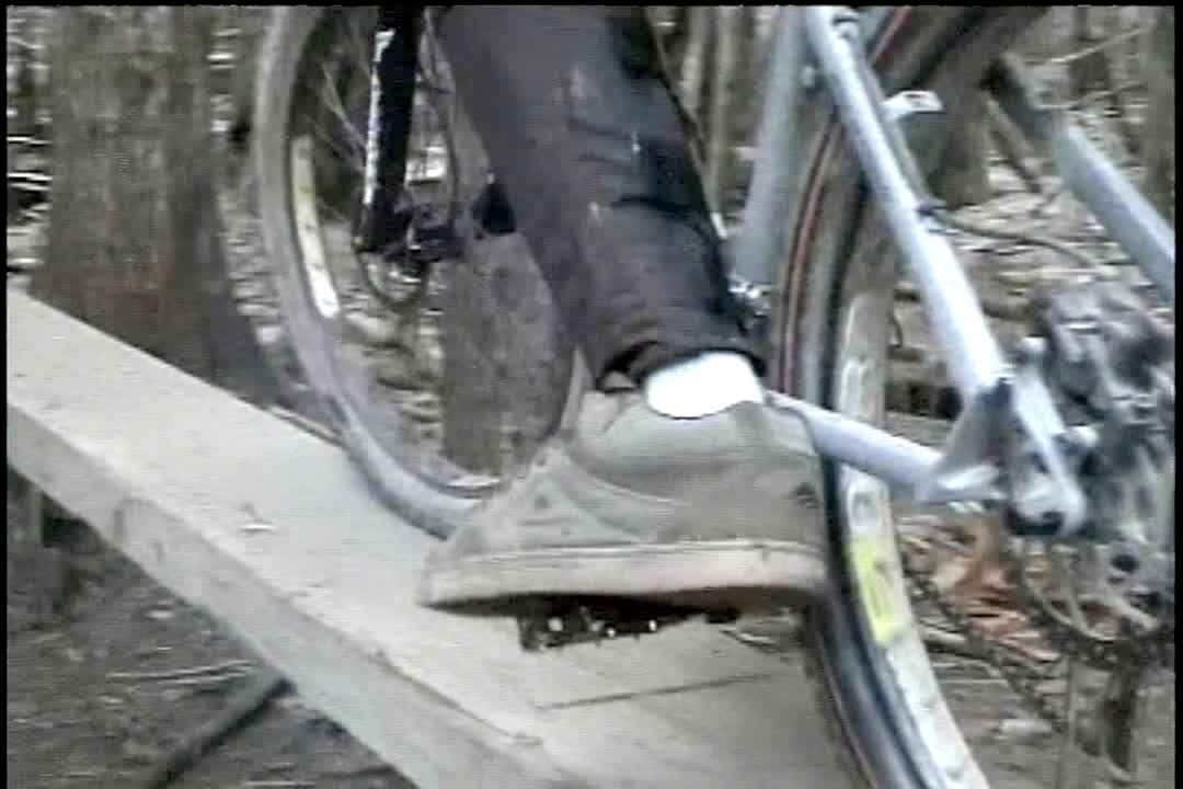 A teen boy rides his bicycle off a ramp in slow motion and he falls off of it, then it flips over and he hits his groin when he lands on the bike in a creek.