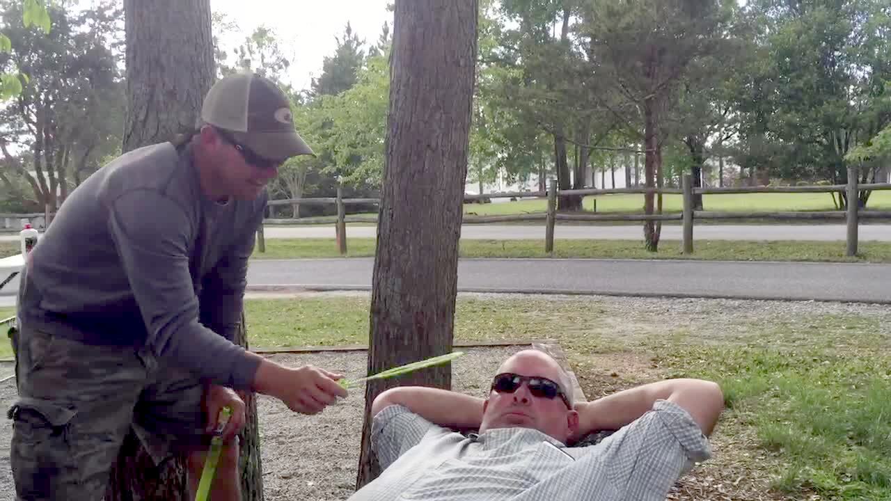 Man sleeps in chair, man behind camera holds sleeping man's nose closed. When man wakes up, he's surprised by camera in his face. Practical joke.