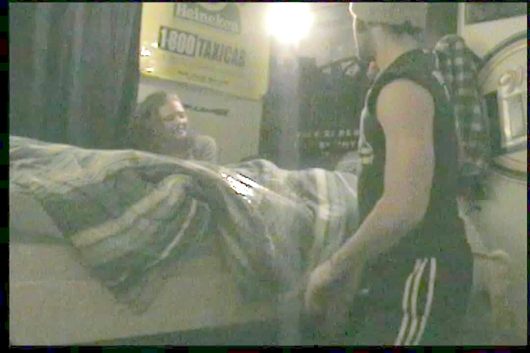 Man snores very loud & makes funny noises like he's choking. Other man videotapes it in night shot. Sleep.