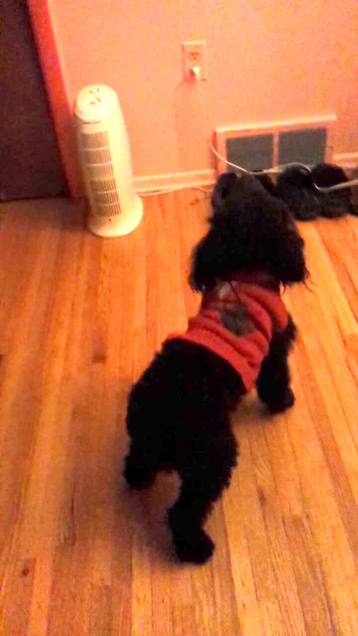 Black dog makes a noise when he's told to be sad. Dog also barks when he's told to tell a story. Silly pet tricks.