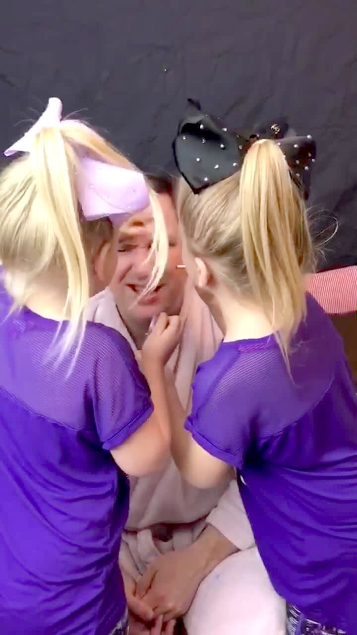 Two wtin girls put makeup and a wig on their dad. He gets into it and strikes poses. #AFVDad musical.ly AA