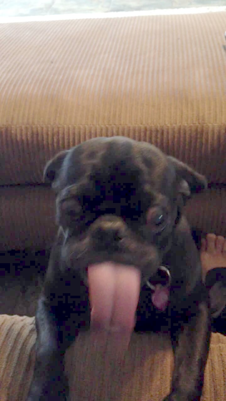 A pug dog licks its extremely long tongue.