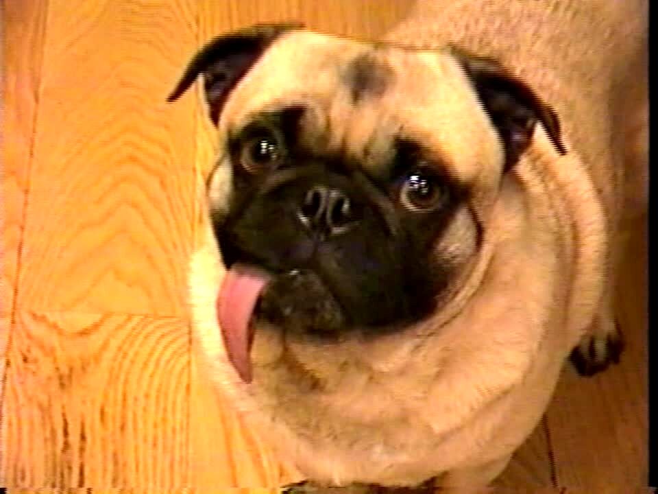 A pug dog licks its lips in slow motion with a long tongue at home.