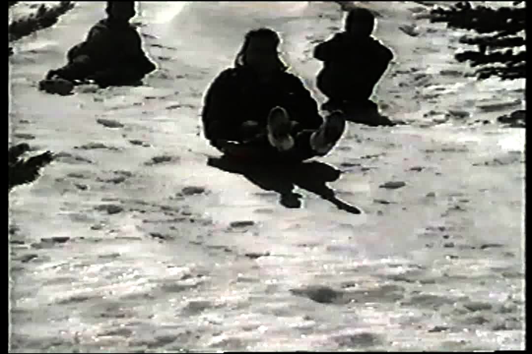Woman riding sled in snow runs into tree. Head makes good sound effect.