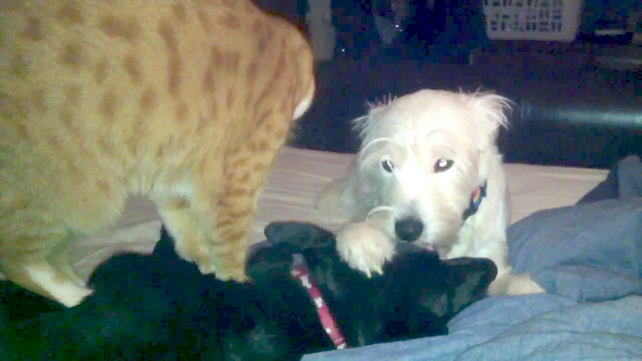 A puppy dog chews on a chew stick and a cat meows. The camera turns and the cat's face is right in the camera, looking for attention.