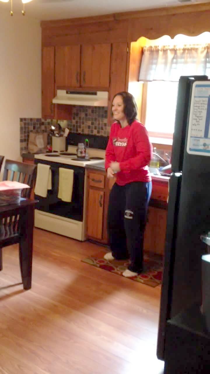 Woman falls down while wearing Heelies sneakers with wheels in the kitchen.