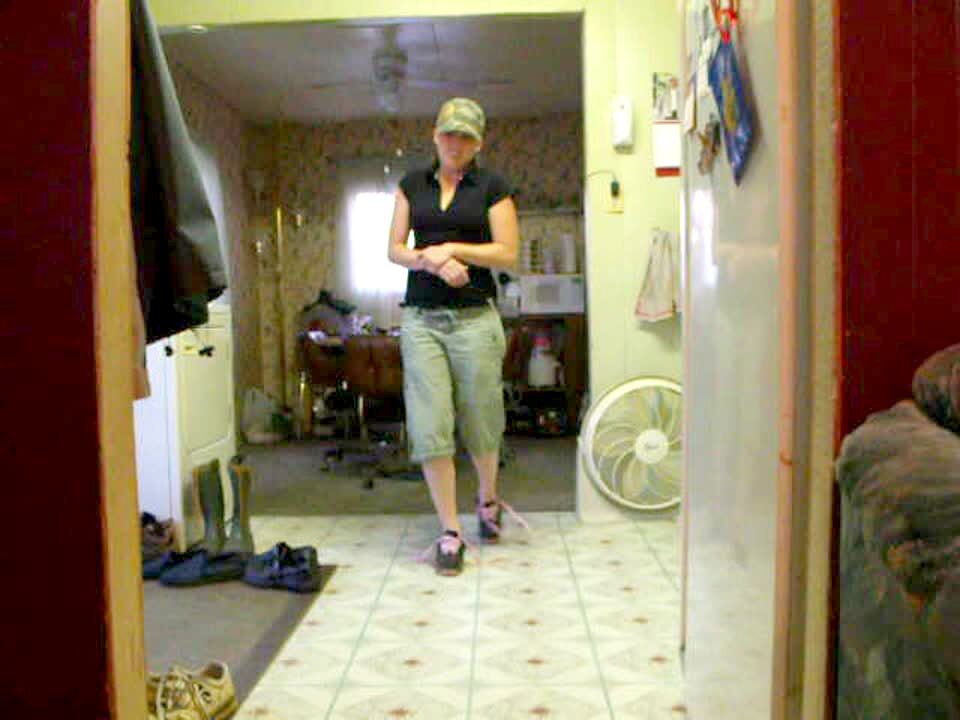 "Head Over High Heels" A young woman practices walking down a runway and posing like a model. She stumbles in high heels and falls off the runway onto the floor. Small fall.