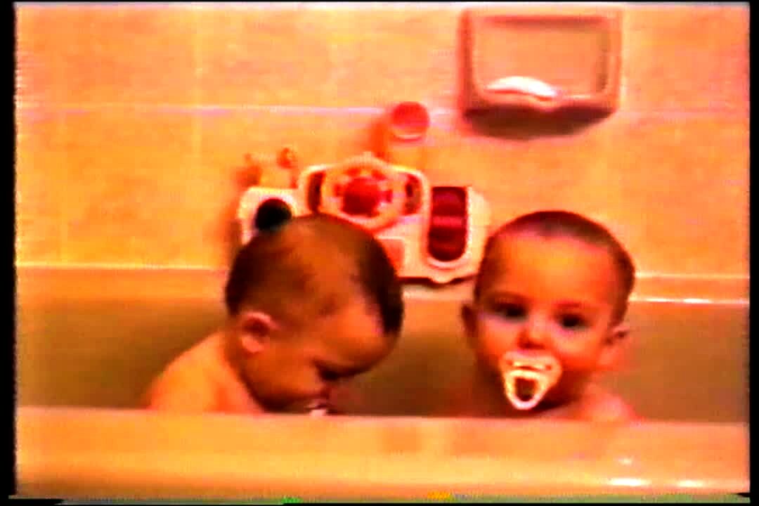 Pacifier Switch. Baby's in bathtub switch pacifiers back and forth.
