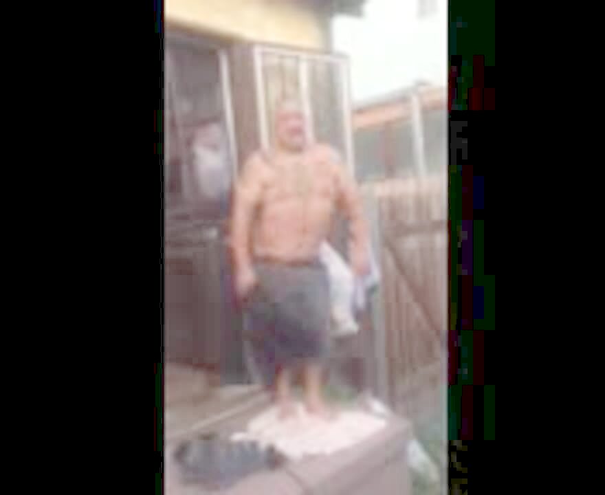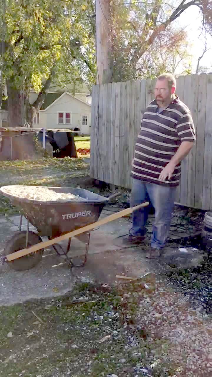 Man rides a tractor lawn mower in the backyard with a girl on his lap. They hit a tree when man is not paying attention & looking at the camera. Girl cries. Bonehead.