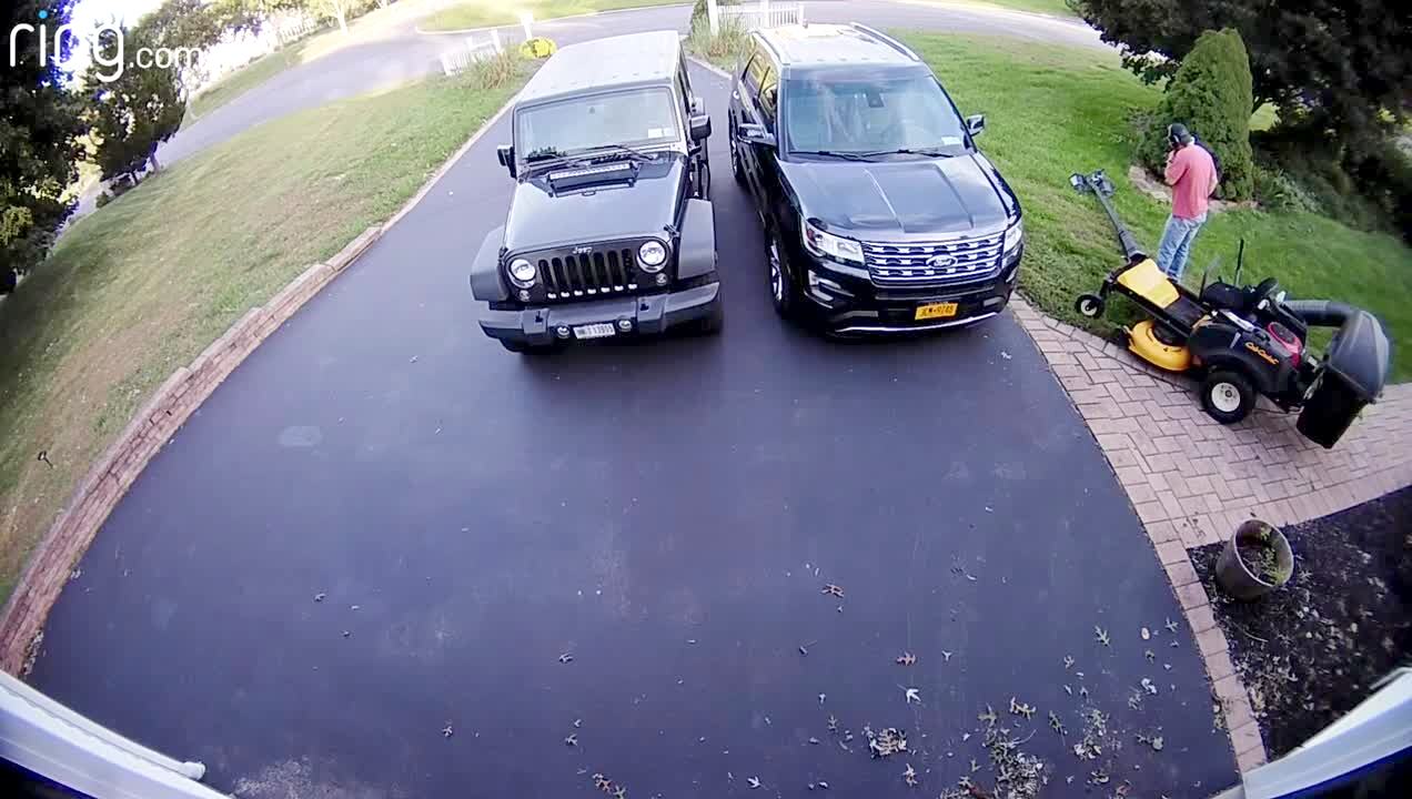 Home security footage of a man who knocks over a lamppost in the front yard with his lawn mower.