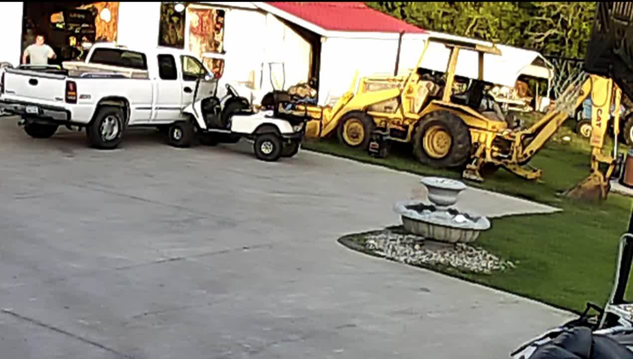 Home security footage of a man who accidentally drives a golf cart in to a truck parked outside of a shed after he runs inside of the shed to get a cooler and then places the cooler on the floor of the golf cart while it presses down the gas pedal.