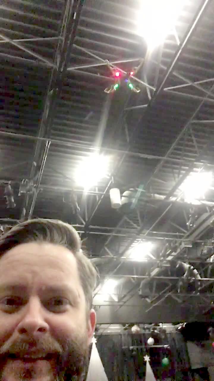 A man films himself while a drone flies above him until it crashes on to his head in an auditorium.